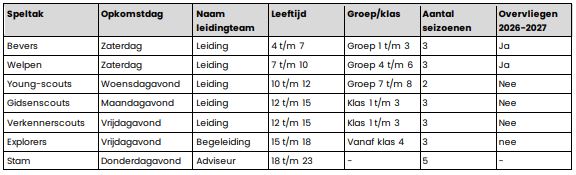 In onderstaande tabel staan de speltakken met de nieuwe leeftijden beschreven.